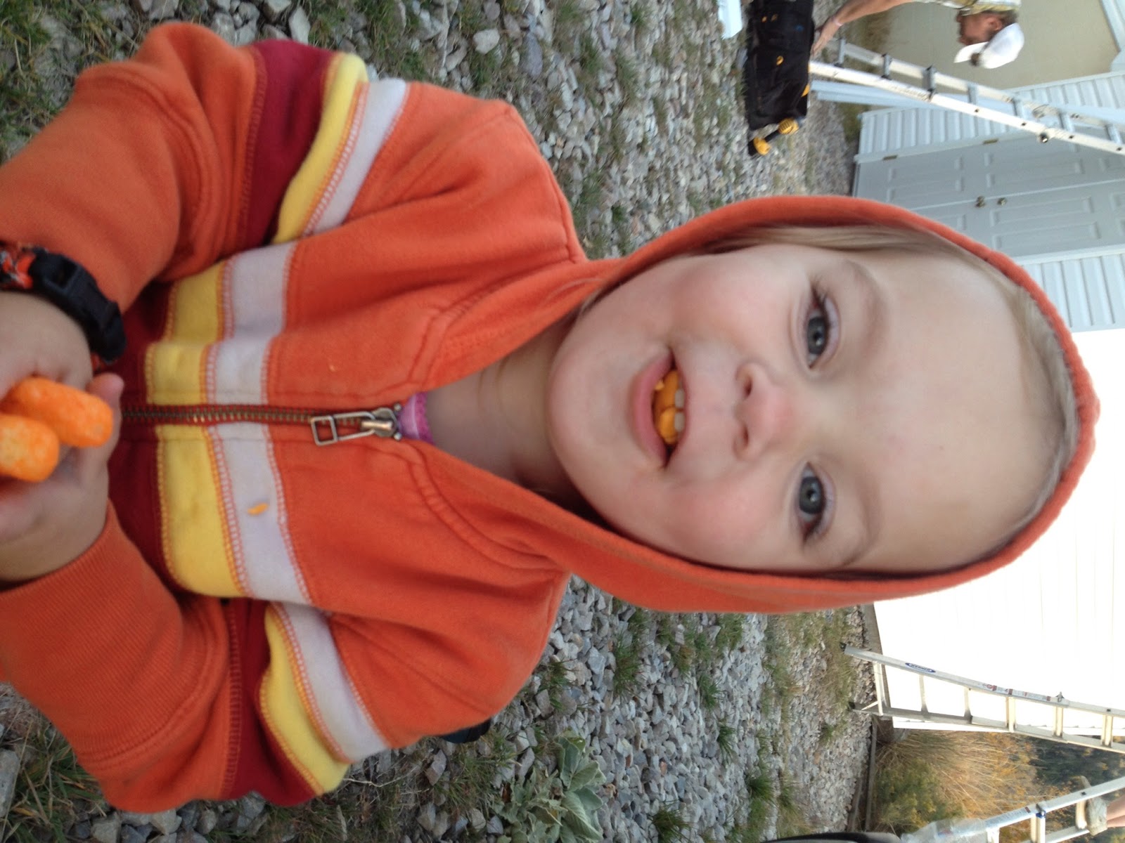 clara had a hard time waiting to eat so i gave her some goldfish to tide her over. well as soon as sha (rob's wife) broke out some cheetos, that was all clara wanted. sha told her she had to eat her goldfish first because both of her hands were full. she promptly shoved both handfuls into her mouth and held out her hands for some cheetos!
